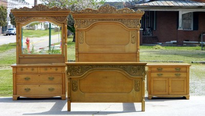 Click Here. Double your traffic. Get Vendio Gallery- At present F. Being offered for sale is a Very prissy Tiger Oak Bedroom Prepare circa 1900. The bed avowal wonderful ... more applied carvings and a big tiger oak panel. The dresser offers matching carvings over a large mirror(in perfect condition) Two pocket-sized drawers over to large offering great storage. At that place is a key. A couple of the locks work, a couple are frozen. The washstand features three drawers and space for the bedchamber pot. The fix is in excellent status and has been refinished at some betoken giving a cute golden color. There is some slight discoloration on the washstand and dresser tops due to age and utilize. If you are a lover of solid tiger oak, this sturdy 3 slice sleeping room prepare is sure to add beauty and charm to whatsoever sleeping accommodation. This is a full size bed, please measure your mattress and springs to ensure proper fit. Measurements: BED Dresser Washstand 72 inches high 84 inches high 30 inches high 58 inches wide 49 inches wide 37 inches wide nineteen inches deep 22 inches deep 18 inches deep Mattress Area 54 wide 76 long Please view all 12 pictures every bit office of the description. We try very difficult to describe items as accurately as possible and will be happy to respond any questions or concerns before purchase. Call 252-238-2244 ask for Janine*Thi southward will exist freight aircraft and co uld ta ke 6 to 8 weeks for commitment. Depending on shippers sched ule* For More than cute Antiques~~State. Federal, Empire, Victorian, Eastlake, Lighting and Accessories bank check out our Ebay Store"jeansantiques" Antiquarian CONDITION Please remember that vintage items and antiques are treasures that have been lived with. Loved and used for generations and will bear witness signs of that love and use having minor imperfections and maybe a repair, which ways the particular has been loved and cherished for many, many years. Don't look these items to be perfect the grapheme they have gained over the years and the stories they tell are part of the allure and charm of these wonderful treasures. Please annotation fre