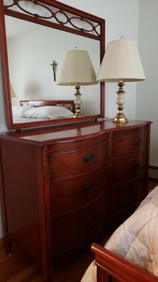 Solid maple construction. All pieces in good condition but could use refinishing. This is local choice-up only. The mirror is46" broad by31" high.