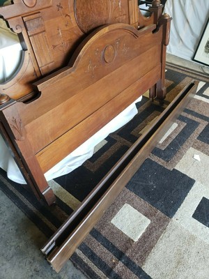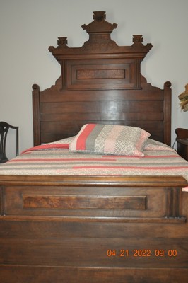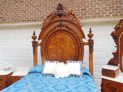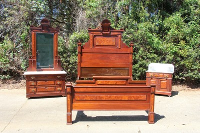 Click Here. Double your traffic. Get Vendio Gallery- At present F. Offered for sale is a three Piece Walnut Victorian Bedroom Set circa 1870. This fix features an ... more arched height bed with a beautifully carved crest over an inset panel and horizontal raised bulge panels. The foot board likewise has a raised burl console. The princess or deep well dresser offers the same rounded elevation and crest equally the bed. Candle shelves are located on each side of the mirror. Raised burled panels and tear drop pulls beautify each drawer~2 small. 2 large. The matching washstand offers a nice storage, with a drawer and large storage area behind paneled doors. This Walnut Victorian bedchamber set is in very nice condition for information technology age. The white and grey marble shows only normal signs of employ having some slight discoloration. Simply no cracks or breaks. There is a repair to the footboard which is very sturdy and secure, non an upshot and not very noticable~see moving picture#four. As yous can run into in the photos the rails accept been extended to suit a full size mattress. The gear up is signed past the maker"D Thou Allen Savannah Ga. If you dearest the quality and beauty of the Victorian era, but don't have the space for 1 of the massive bedroom sets of the period, this is the one for you. Measurements: BED DRESSER Washstand 88 inches high 84 inches high 36 inches high sixty inches wide 41 inches wide 26 inches wide 82 inches long 17 1/2 inches deep 14 inches deep Mattress area 54 wide 76 long height to center of dresser is 24 inches meridian of marble to floor 28 inches Please view all 12 pictures as function of the description. Nosotros try very hard to describe items every bit accurately as possible and will be happy to answer any questions or concerns before purchase. Call 252-238-2244 enquire for Janine*Thi south will be freight aircraft and co uld ta ke half-dozen to viii weeks for delivery. Depending on shippers sched ule* For More beautiful Antiques~~Country. Federal, Empire, Victorian, Eastlake, Lighting and Accessories check out our Ebay Shop"jeansantiques" Antiquarian Status Please recollect that vintage