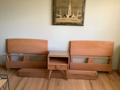 Was in spare chamber and never used past us. 2 twin beds with woods side rails. Model m930.